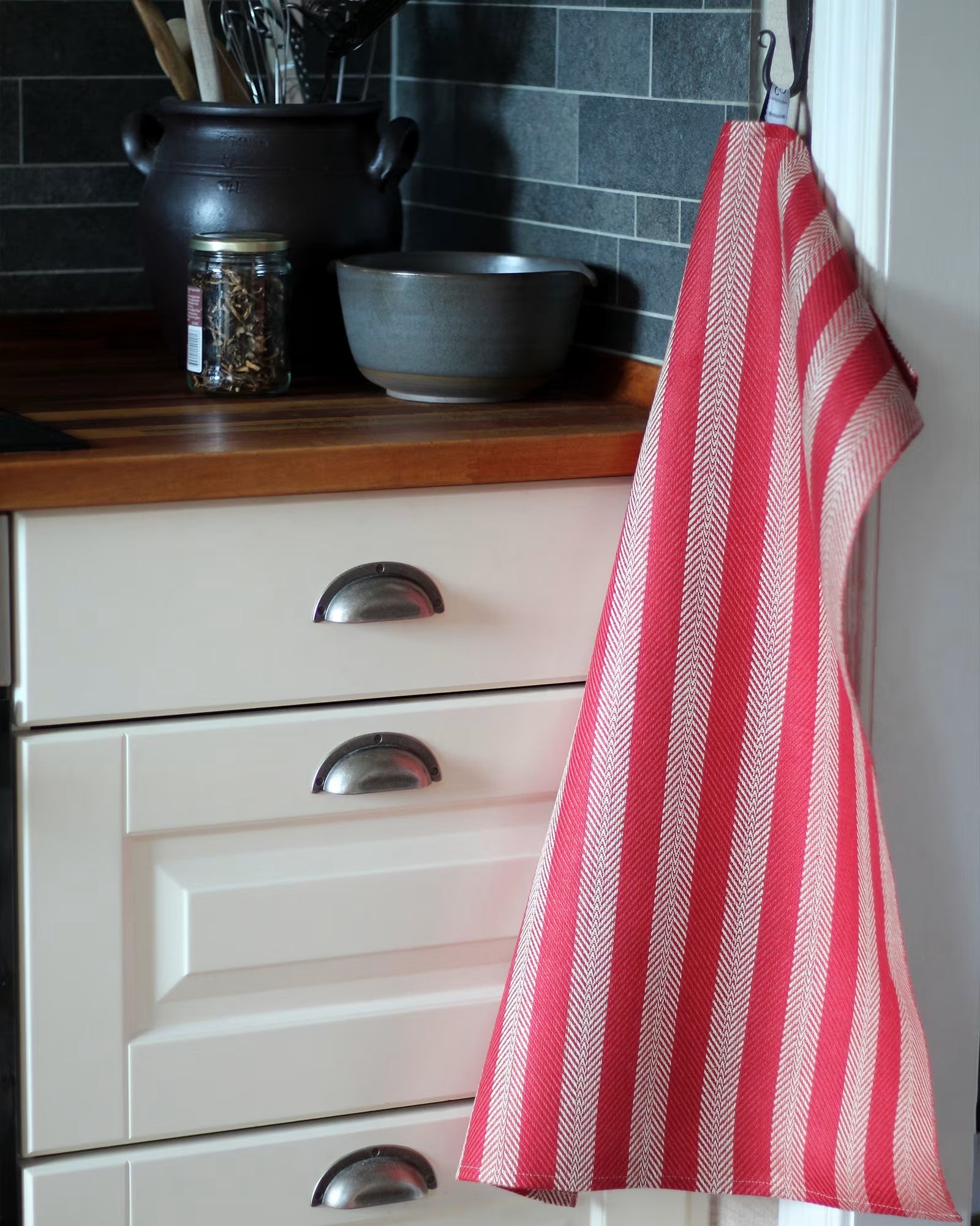 En varm glöd av rött och oblekt linne som hör hemma i både kök och badrum. Med sina stilrena ränder och den djupt röda tonen får handduken ett uttryck som är både rustikt och elegant.